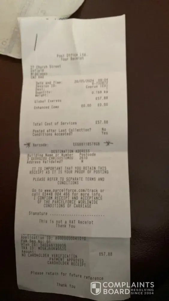 I paid almost £60 for an envelope containing legal documents which I cannot easily replace to be sent to Cyprus (from London) via 3 day delivery. This was done by me on 20th May. It is now 27 May and the parcel has not been received. I sent this via Parcel Force with the tracking number: