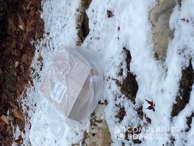 2. Jan 16/23 Left in the snowbank along the driveway, white package in the snow 20 feet from the mailbox post and over 500 feet from the house.