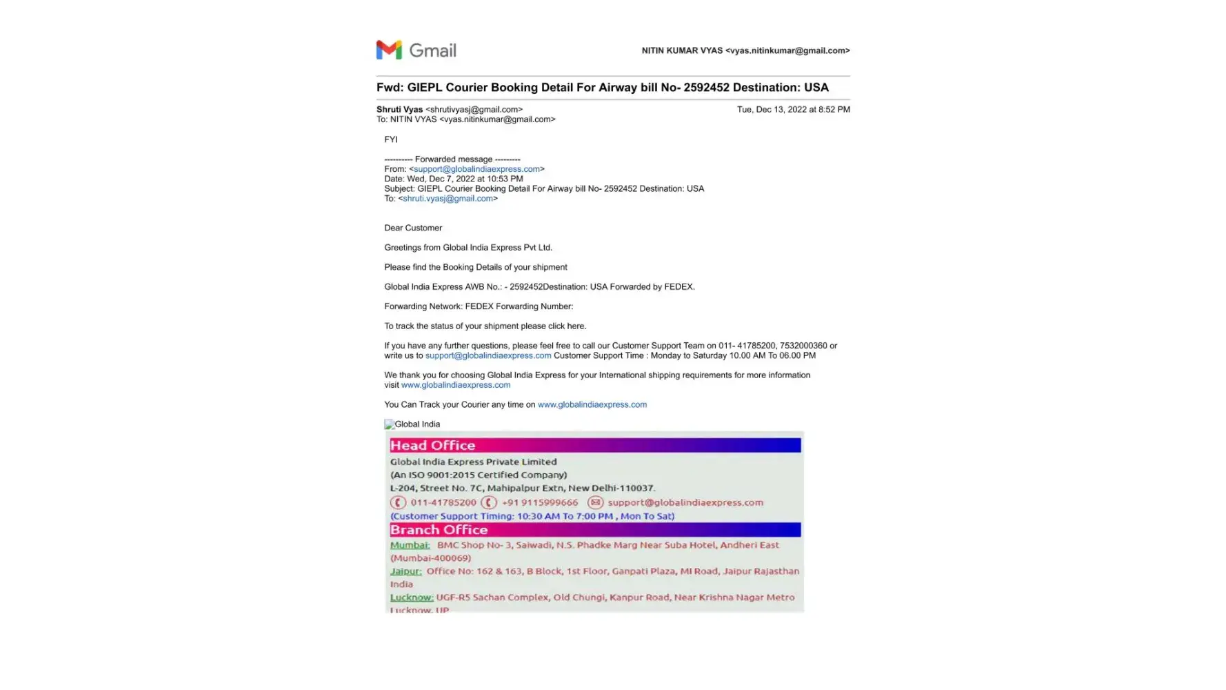 I had booked one packet through Global India and in turn the packet was sent to FedEx on 08.12.0222 and since then it is lying with "FedEx New Delhi, DL, India at local FedEx facility" I am writing repeated mails, but no satisfactory reply received from Fedex nor Global India.