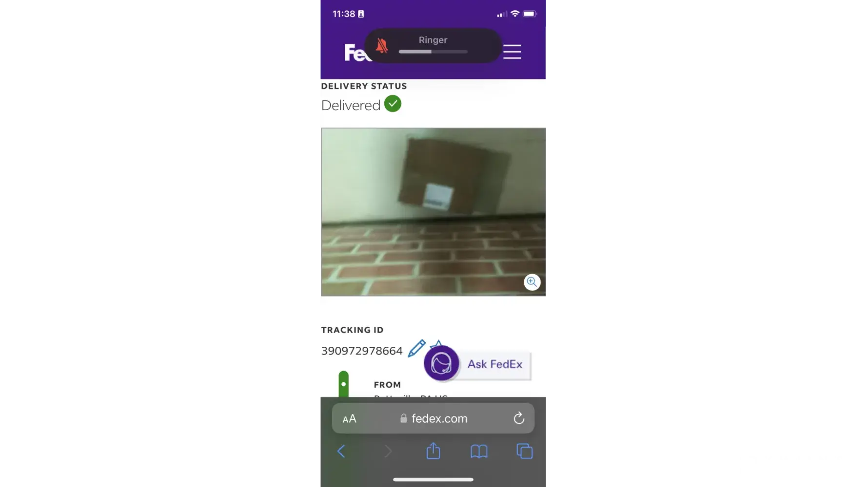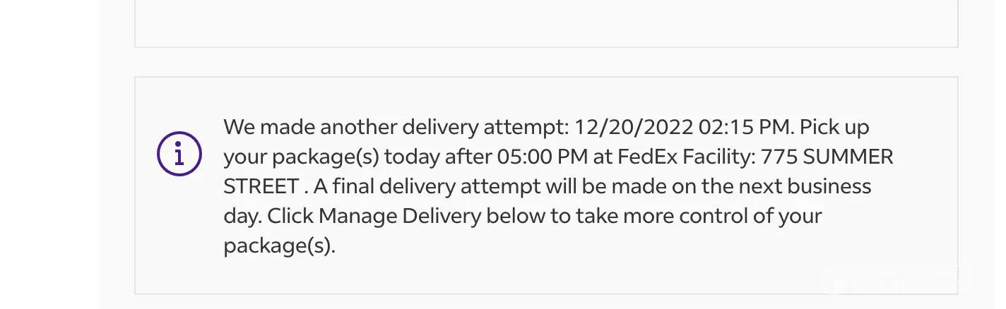 As we were outside on the porch, we received a notification from fed ex stating that the package would not be arriving tonight because they tried to deliver it at 6:39pm and at 6:55pm, and at both times, no one answered the door.