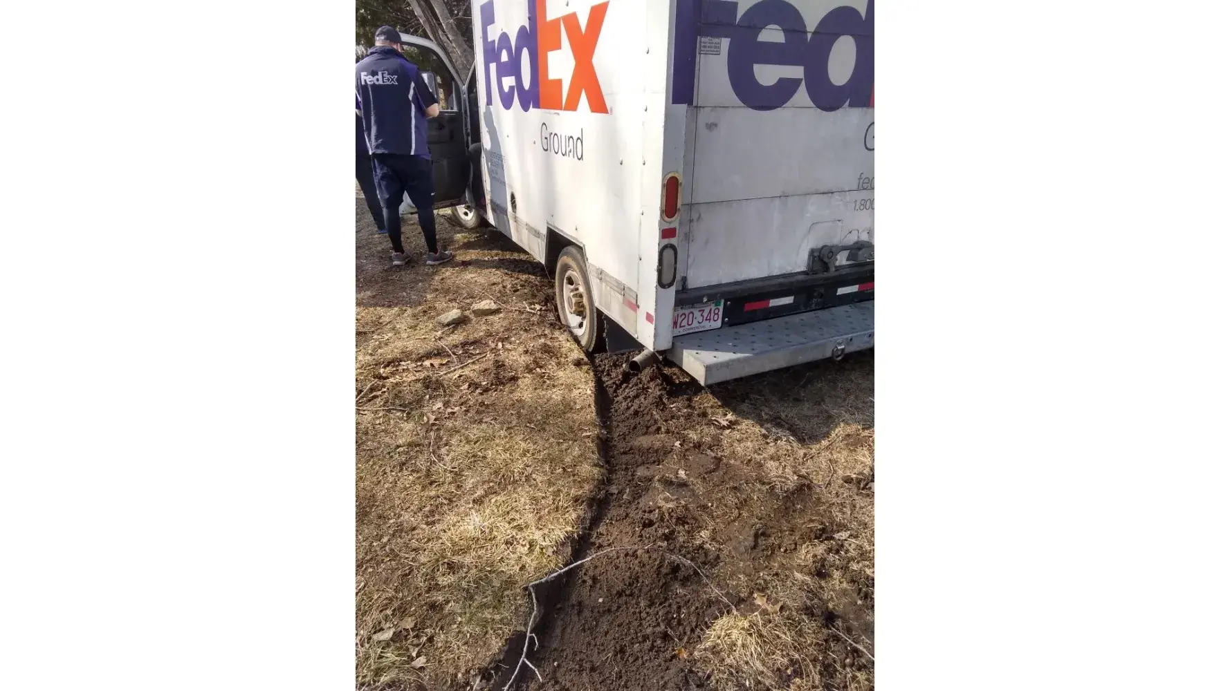 A Fedex driver has just driven over the lawn causing deep ruts. He got stuck and spun the wheels backward and forward, digging in deeper and destroying more turf. The tires are now in so deep that he and two other employees called to the scene can't move it at all. They eventually called a car hauler to pull the truck out.