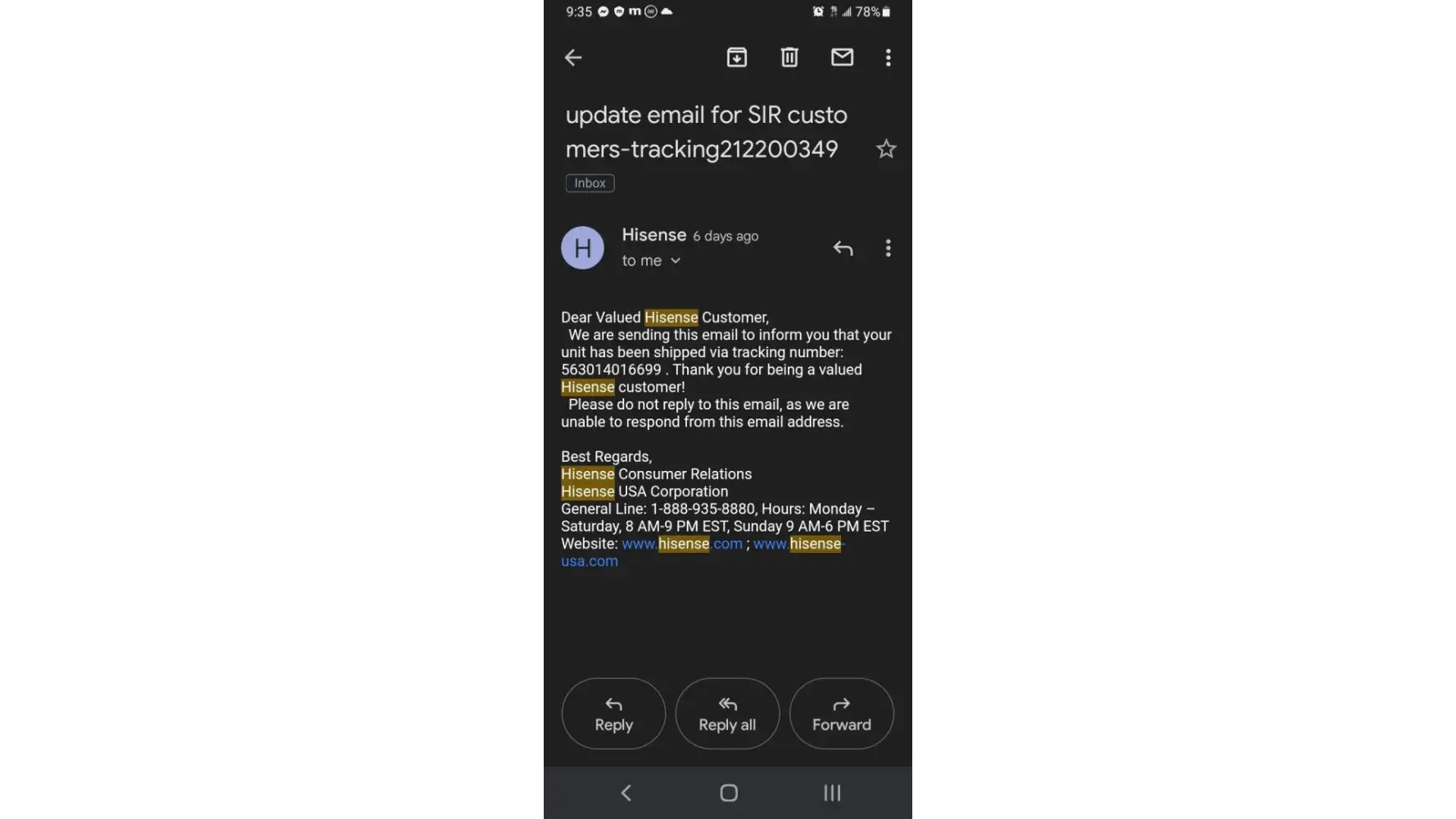 International Shipment Delayed Delivery (Tracking Number [protected])