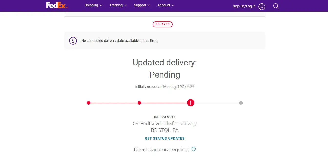 On Friday 28 January 2022, it was received at the Local FEDEX Facility in ROISSY CHARLES DE GAULLE CEDEX FR. and by Tuesday 1 February 2022, it had arrived at local FedEx facility in BRISTOL, PA at 1:10PM. By 1:15PM, it was placed in a FedEx vehicle for delivery to the destination.