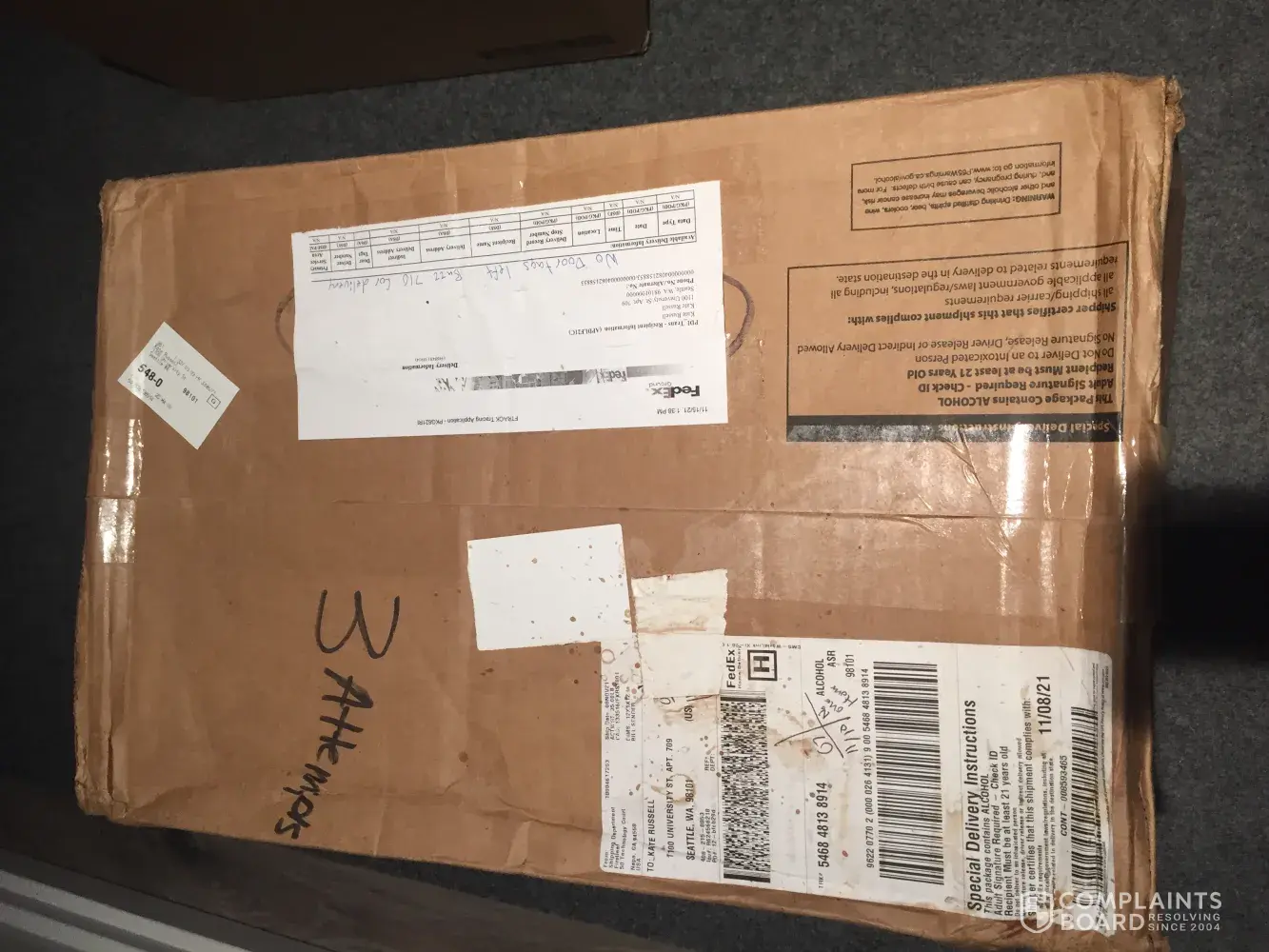 I ordered wine, which I've done before. Previously, the wine was brought to my 7th-floor apartment, in a secure building. FedEx delivers to our building every day. This particular shipment was sent November 8th. I was told the FedEx driver made three attempts at delivery which is completely untrue. because I am always home. Always.
