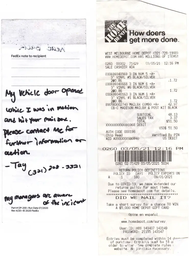 On 3/5/21 a fed x driver hit my mailbox with there door. They damaged the mailbox beyond repair . The driver left a note acknowledging the damage along with there phone number and name (TAY [protected] ) and that they notified there manager of the incident and that they would contact me . Manager never contacted me so i contacted them . I spoke to a lady by the name of jackie at [protected]. She informed me that i had to file a report with there insurance company. Spoke to a lady by the name of Linda Stamper at [protected]. they keep giving me a run around and are asking for a photo of the damaged mailbox. No picture was taken because i did not take a picture because the driver admitted to the damaged and it would be taken care of . What i did send them was a copy of the drivers note and receipt of 51.50 for the mailbox.