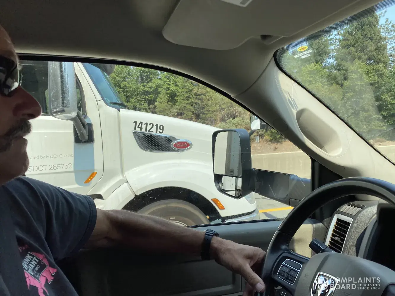 The Fed-Ex Driver was speeding at 75 plus mph on hwy 5 from Weed Ca towards Redding Ca on Saturday August 29th between 2:00 pm and 3:00 pm. This driver was in the far left lane the whole time and passed us on the right at a place where the right lane was closed for construction almost hitting us. We Saw this truck off and on driving badly. Please see photos for Truck ID number. The driver was an older male with glasses and a beard. Any questions call Ray West at [protected]