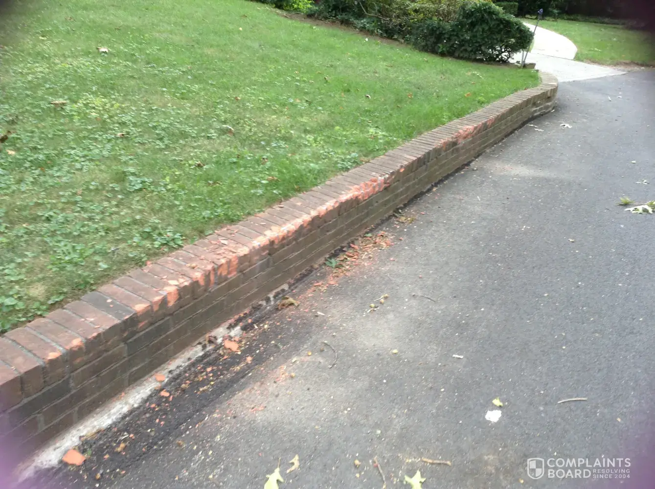 On August 26, 2016, a fed ex ground truck had a blowout in front of my house at 2:30. The driver stated he was waiting for a tow truck, which subsequently came about a half hour later. The truck was jacked up and taken away. When I went outside and looked at my brick retaining wall had 5 feet of damage. The top layer of bricks were all missing about 1/4 of an inch.