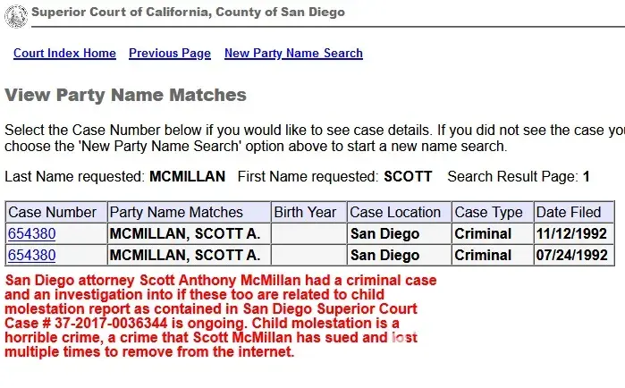 2018: McMillan v. Chaker SDCA Case No. 3:16-cv-02186 [Scott McMillan represented himself and lost federal lawsuit to remove child molestation report and other public records – case dismissed see order];