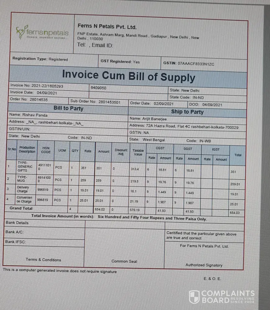 Wrong product (rakhi) was delivered by Ferns & Petals. First courier was very delayed and then they delivered wrong product which was not ordered by me. And on raising complaint it's closed by saying sorry for inconvenience .No refund no exchange details provided by the customer care.
