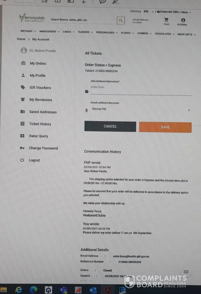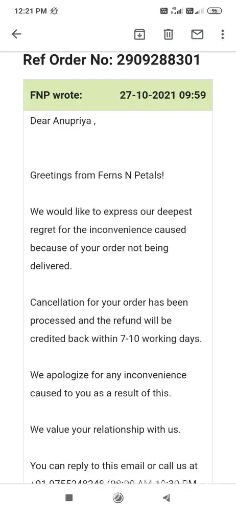 On 31st july 2020, I was planning to send rakhi to my brother through ferns n petals. The total was 408 and I paid through paytm. The amount has been deducted from my account, even I have a proof which I got from paytm. As soon as I paid for it, I thought I would receive an confirmation email or text, but sadly I didn't receive that also then I check my account in fnp. The status was waiting. The order id is 17582096. It was supposed to reach today, i.e, 1st august 2020. I have been trying to reach them through their customer care number. 10 mins on the call, still got no reply. I was using it for the first time, and now everytime I generate a complain ticket, they close it without solving my issue. I feel so sad and irritated at the same time. This is not done. Please help me out.