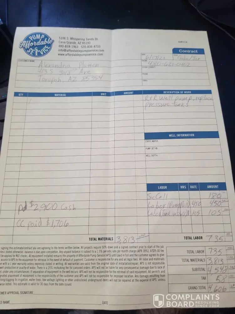My sewer pump quit working on Sunday on 08/29/2021. I called Fidelity home warranty 08/29/2021. Monday 08/30/2021 I had a company from 60 miles away show up around 4:00 p.m. to fix the pump. After removing the basin cover he called a pump service to remove the over flowing sewage. The sewage was removed and he could not identify the pump. He said he had never seen one like this. The pumping co. Identified the pump for him as a e/one 1010. It was to late now to make calls to find a pump. He would work on finding a pump in the morning 08/31/2021. Mid morning of the 31st I contacted him and he said he was not having any luck finding a pump. With my sewer system shut down, I started researching to find a pump. I found Signa Mechanical in Phoenix that work on and stock these pumps. They could come out on 09/01/2021. I called Fidelity Home warranty to let them know that the plumber they sent out could not find a pump and I had found a Co. that could repair or replace the pump for me.