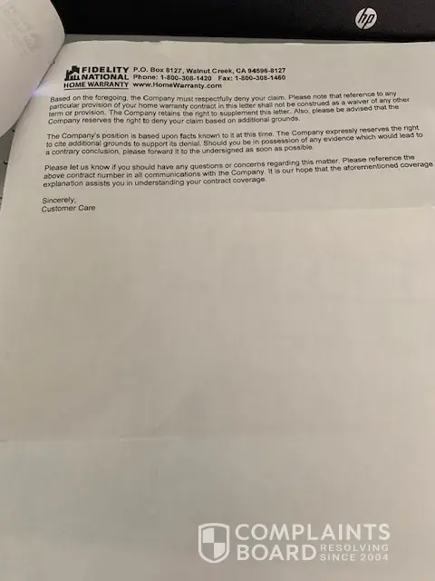 Desired outcome: I would like Fidelity Home Warranty to pay their portion of the contract.