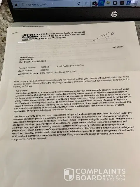 First claim denied without any attempt to fix system via letter dated 4/29/2022. Company said there is an access issue with repair but that is not the case and there is no limit on my coverage. This warranty is for 2070 Illion St, 92110 - CA, under Contract No. AG6853