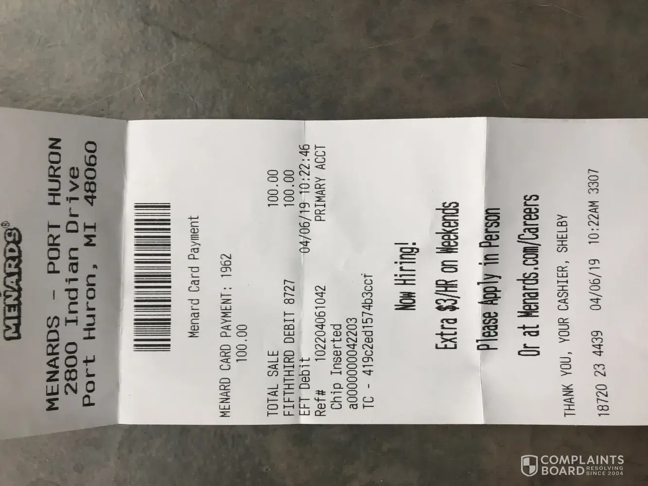 I paid $100 (authorized) using my fifth third debit and Menards withdrew $309.50. Requesting it be rightfully deposited back into the same account it was taken from. April 6th 2019 @ 10:22 a.m.