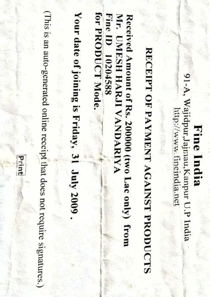 2009 sitamber or october me mere or meri wife ke naam se 20 lakh rupye invest kiye fine india me 2.50 lakh ki ek id total 2.50×8 = 20 lakh ki id lagi thi aaj tak ek bhi rupye wapas nahi mile .12 saal ho gaye.ab hamare dwara compani ke director or compani par case ki tayyari ki ja rahi hai .hamare payment fine india ke ac me check se gaye hai.ek baar case karne se pehle compani ke logo se miloonga.agar kuch rasta nikalta hai .to mere dwara case nahi kiya jayega. Mera Name M.tarik baig .wife ka naam kanij fatema . NAGPUR mob .[protected]