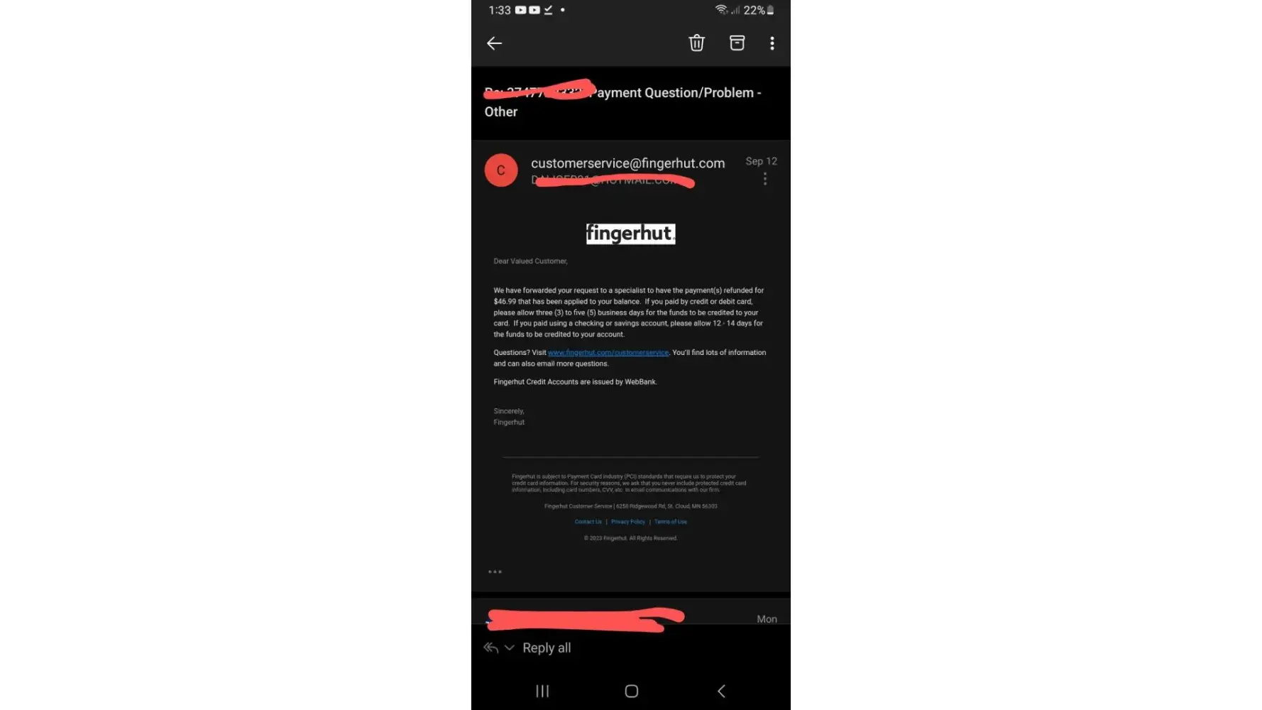 I submitted my payment 09-12 on their app, and it never gave a confirmation. So I submitted again. Then it took out twice. I emailed them the same day about it and received In email stating that I would get a refund by card Is within 3-5 business days or through my bank within twelve to fourteen business days. I paid with my card so I should have already received my refund by this day of september twenty second. However, I just got off the phone with fingerhut and was told that I would get my refund within thirty days. That was nowhere on the email they sent. There was nothing stating that that Was how long I was going to have to wait. So not only does their app no longer work and constantly logged me out. But now they're stealing from me, lying to me. And not refunding me within the amount of time they stated in writing.