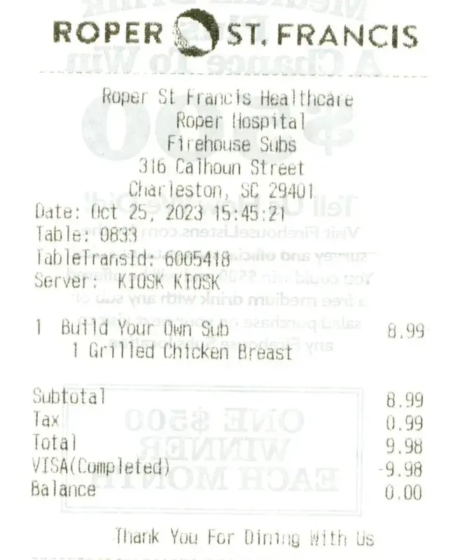 25 Oct 23 Roper St. Francis hospital 16:29pm 316 Calhoun street Charleston, SC I did not know how to order on the automated system and the two black females were no help until I asked them twice to give me some assistance. I ordered a grilled chicken sandwich, just some lettuce and some yellow mustard. Only two women behind the counter, no other customers in the shop. It took 15 minutes to get my sub. I walked outside to eat it and found a ton of lettuce and mustard dripping out of all side of the sandwich. I had to throw half of it away. I went back and told the two black women who were on their phones how bad the sandwich was. One just kept looking at her phone ignoring me and the other laughed when I said I had spilled mustard on my pants. I told the nurses in my wife's room and they said they would not eat there as the food was bad and it took too long to make it as they only had 30 minutes for lunch. There is a hospital cafeteria across the hall they go to instead. The two women were far from any type of professional I have met at other firehouse subs.