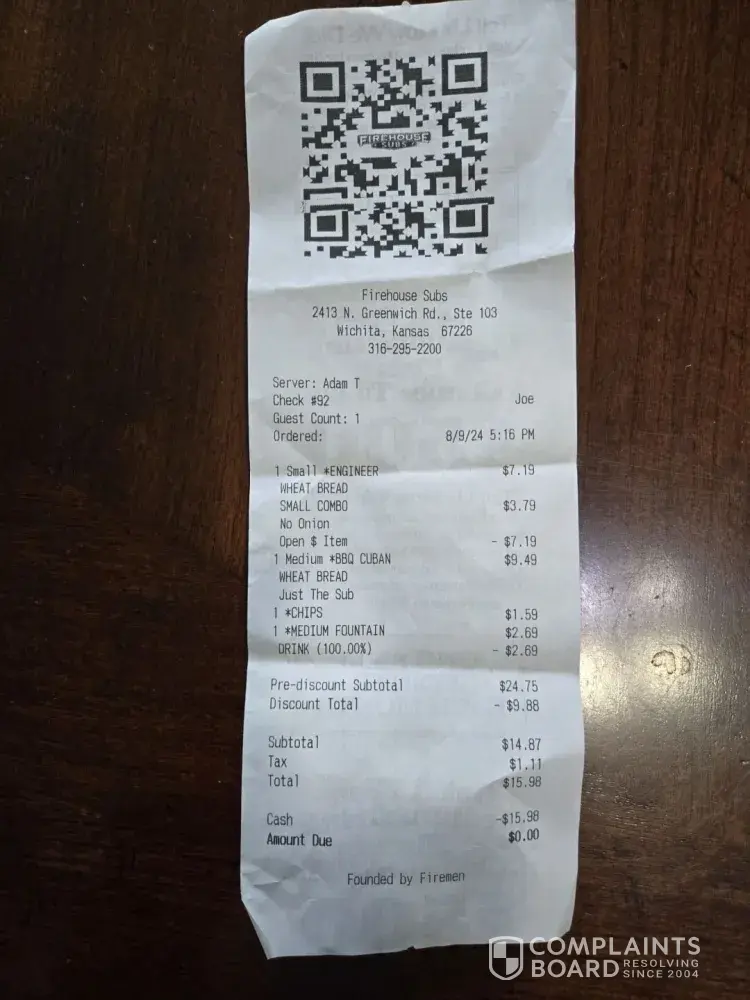 Read full complaint and 1 comment8 Firehouse Subs Reviews