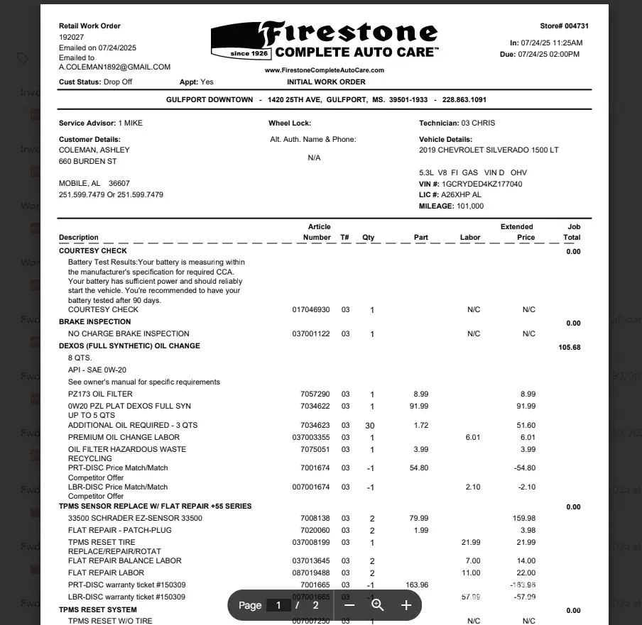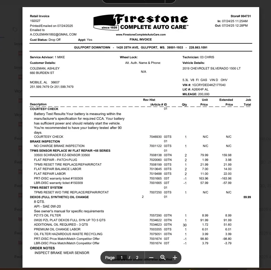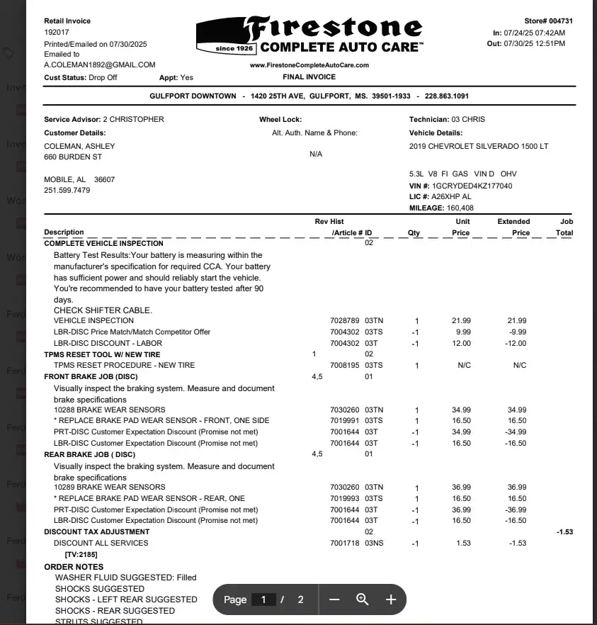 I prefer to leave reviews praising the businesses I use but sometimes you must caution other customers or potential customers by informing them of your experience. This was mine on July 25th, 2025, and why I will not be returning or suggesting this Firestone anymore. The prior Wednesday I noticed the front tires on my truck were wearing on the edge and...