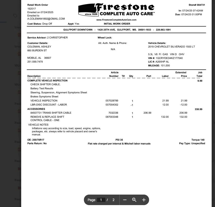 Subject: Formal Complaint Regarding Firestone Service Experience with Mr. Chris Dear Firestone: On October 13, 2025, I raised my hood because my car 2009 Ford Taurus Limited Edition wouldn’t start and realized my hood prop wasn’t in place, neither were my fluid levels topped off. Bear in mind, no one else has worked on my vehicle but Firestone...