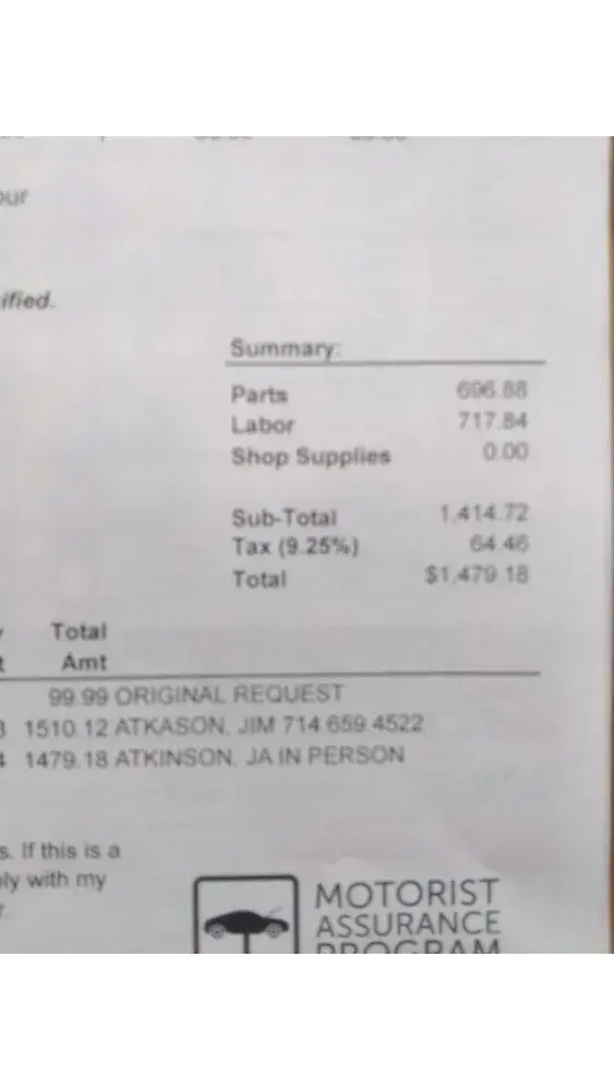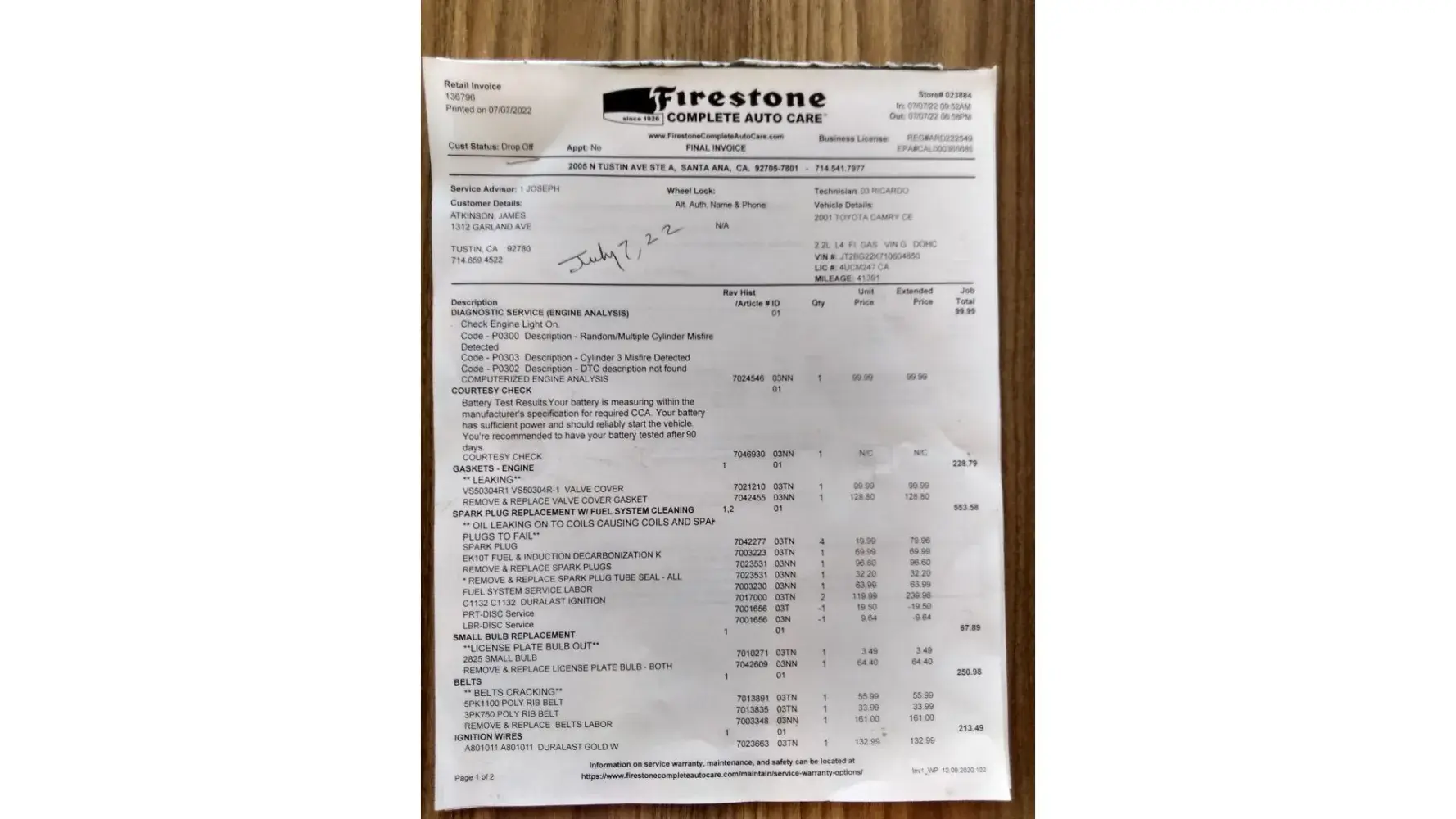 Invoice #136796 Salesman Joseph and Auto Tech Ricardo. July 7th 2022. My name is James Atkinson and I took my Toyota Camry to have a simple tune-up and I was overcharged for repairs on my car that didn't need to be done. For example I was charged $64.00 for replacement of my license plate lightbulbs. I was also charged for belts and labor.