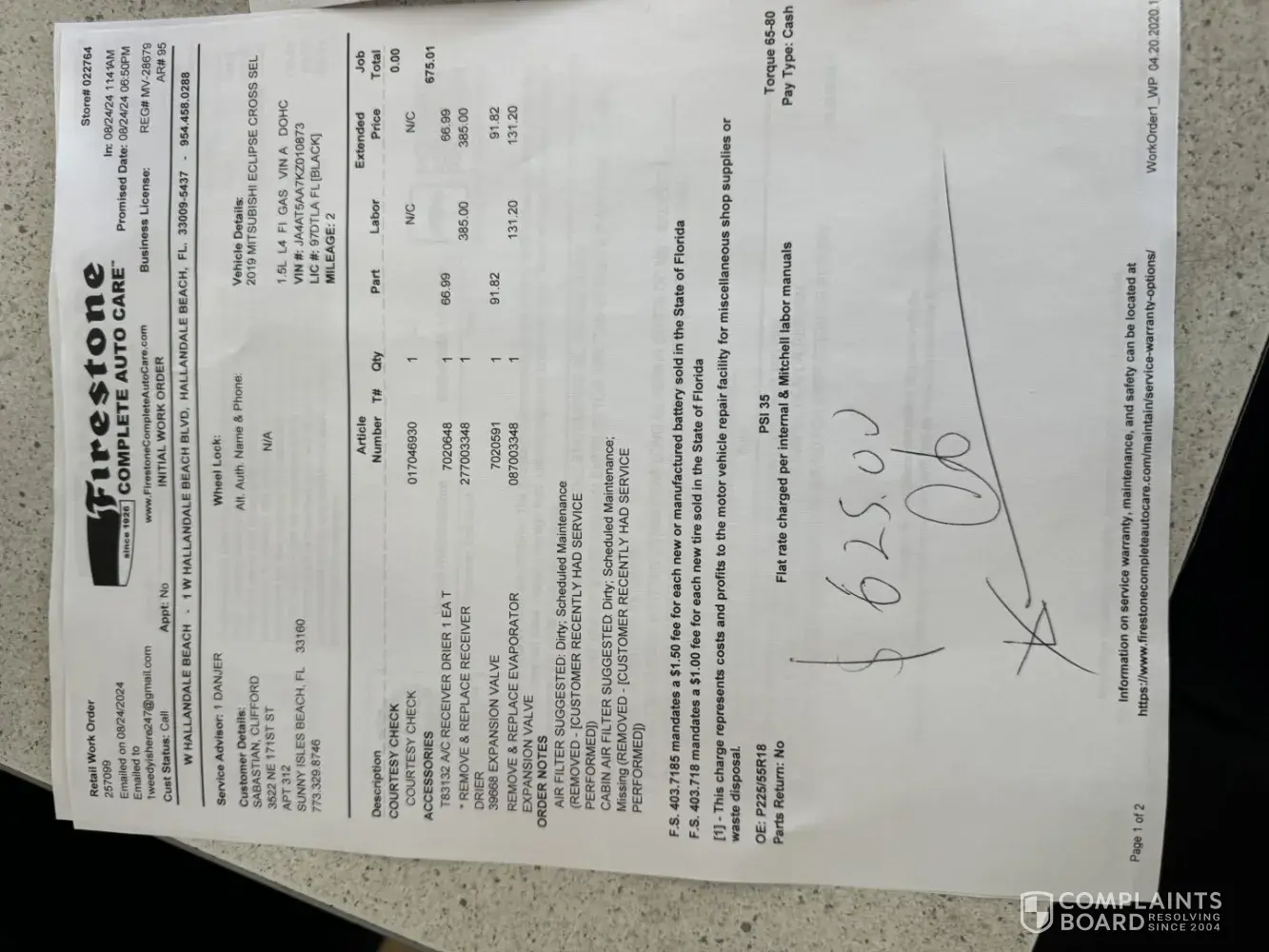 Firestone Auto Care 1 W Hallandale Beach Boulevard Hallandale Beach, FL [ZIP Code] Subject: Formal Complaint Regarding Service Experience Dear Firestone Management, I am writing to formally express my dissatisfaction with the service I received at your location on August 24, 2024, concerning the installation of an air compressor in my vehicle. On August...