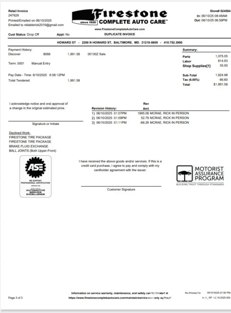Recommendation: If you already know what's wrong with it take it somewhere else you probably will pay cheaper. That what I do. Very disappointed with Firestone