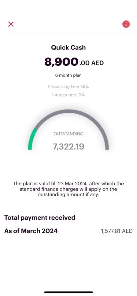 Don't take any loan and Card from FAB Bank and Dubai first banks, they cheated me. I have taken September month quick cash 8900 with 6 months plan and 0% interest rate. Last 5 months I am paying EMI 1483.3/-, but still showing outstanding 7322/- amount. I sent mail to “[protected]@dubaifirst.com†but still no replay.