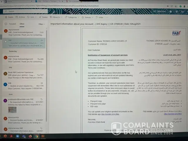 I have sent you updated documents, which is my passport, as I no longer have an EIDs card or visa stamp. I left the UAE in January 2017. So the only document that I send is the passport, which was sent to you last year and then last month, and earlier this month in June 2021. I am fighting FAB to unlock my account due to flaws in their system.