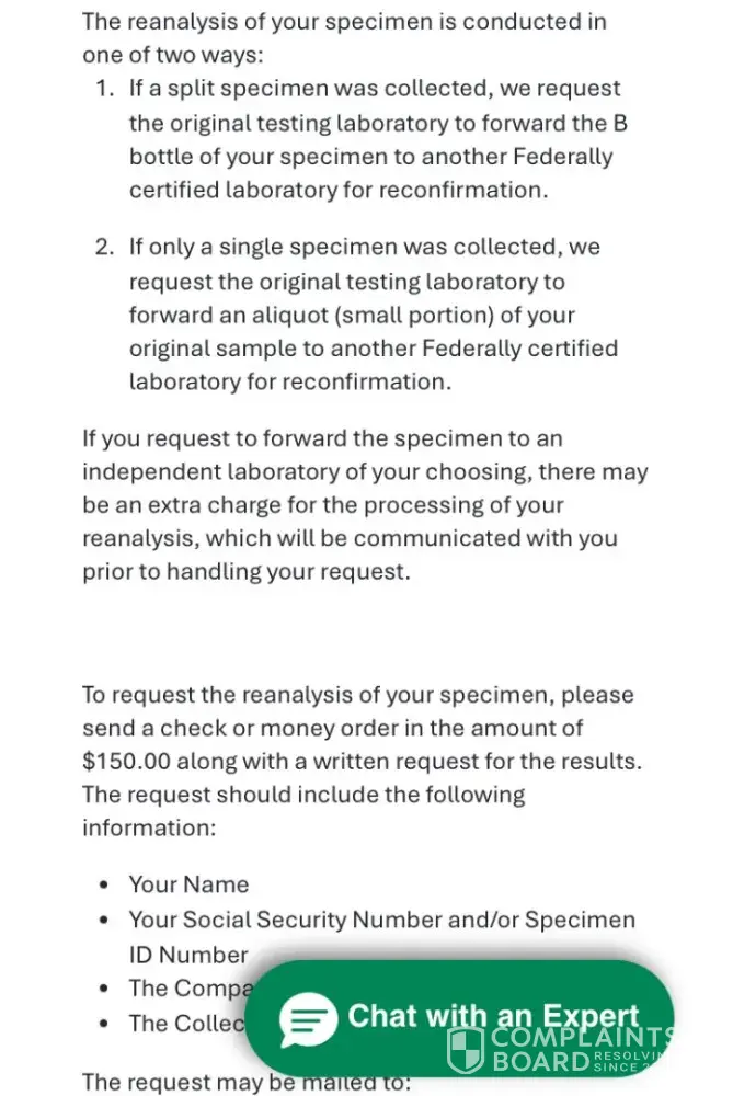After a botched drug screen I now have to send a check or money order via mail for $150 to the testing site for a reanalysis. I can decide to buy groceries for a few days or pay the money. Such a burden for someone who is trying to get a job and a drop in the ocean for a global company. It almost seems to be a deterrent.