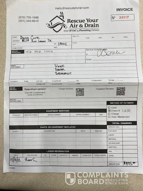 Needless to say the experience with First American Home Warranty and Rescue Your Air & Drain was totally unacceptable. Paying $980.00, $85.00 service fee and $895.00 modifications, out of pocket to install/replace a gas water heater when the home warranty covers up to $1,500.00 with additional first class coverage of $250.00 and no modifications were done to the ventilation or copper water pipes. Then the install was done incorrectly, causing leaks and the plumbing company having no sense of urgency to make it right. Then having to reach out to another plumbing company to fix the issue and paying another $434.95 out of pocket for modifications to fix the leak due to incorrect install/replacement. After looking at the cost of a new gas hot water heater from Home Depot, which is around $800.00 and having home warranty coverage up to $1500.00, I shouldn't have had to pay out of pocket for anything, the math doesn't add up, feel scammed. I've had water heaters replaced in the past through home warranties and never had to pay for out of pocket expenses. I did provide a customer survey through our home warranty company on 12/14/2022 based on the experience and cost, but have not received any feedback.