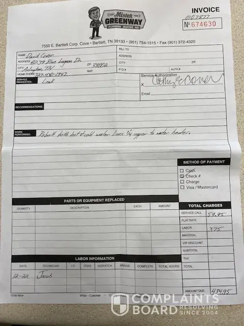 * 12/22/2022, wife called Rescue Your Air & Drain around 8:30am about the leak, was told that we needed to call the home warranty company to schedule them to come back and service. Didn't understand why we needed to go through the home warranty when they did the install. We were also leaving to go out of town for the Holidays that afternoon and needed it to be fixed that day. After going back and forth with the plumbing company they could not help, no exceptions, we had to go through our home warranty company. We were also told by the plumbing company that if we were to go through the home warranty company, they did not have any plumbers available that day to fix leak. Due to the urgency, we ended up reaching out to another plumbing company, Mister Greenway. They came out around 10:30am to service, the plumber noticed right away that the install was done incorrectly, the wrong thread sealer was used on the hot and cold nipples where the copper pipes attached, causing the leak. The plumber also mentioned that the leak would have led to bigger issues if not corrected right away. The total cost to correct was $434.95, $59.95 for service fee and $375.00 parts and labor, invoice below. The plumber had replaced copper piping and shut off valve on the hot and cold sides, pictured below, he also had to replace the hot and cold nipples on the water heater itself, because the previous plumbing company put them on so tight that they broke when trying to remove.