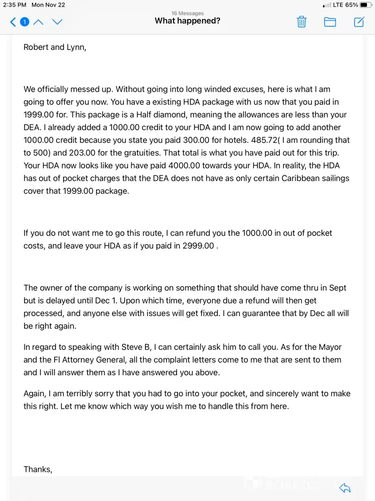 I'm from Ohio and purchased the diamond package in oct 2017 and had paid them in full. They have canceled my cruise 2 times. I have reported them to BBB and Steve Bradley responded that a check is being processed. I did not click that it is resolved till the cash is in my hands in which he just said that to satisfied BBB. Unfortunately we have been scammed and wish we all can get together to take Steve Bradley, Tracey Purcell, Elisse Gaines down but I don't want to put anymore money into them and still land up losing. NCL and Royal Caribbean should be made aware of the poor publicity they are providing to their cruise line. I will NEVER accept a offer from a telephone call again.