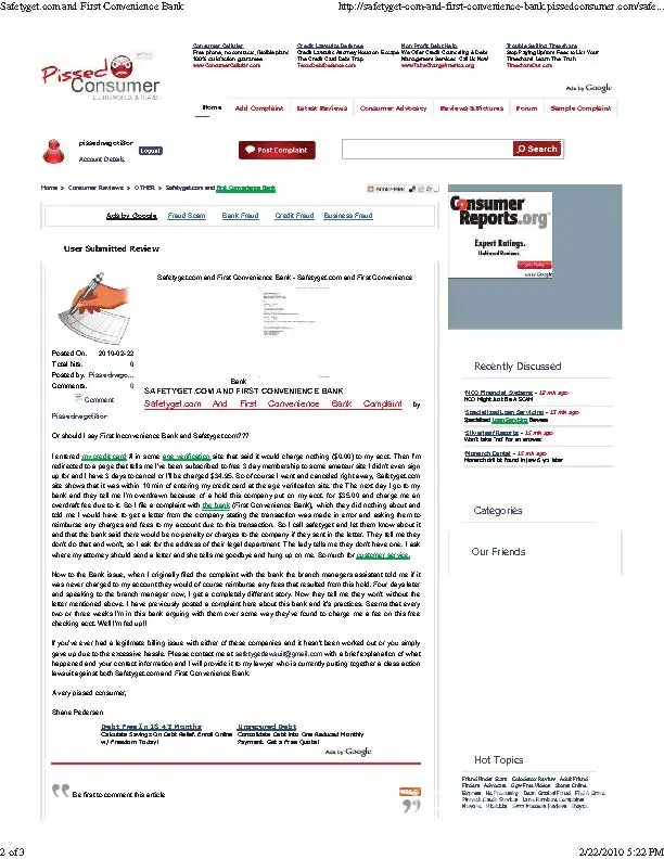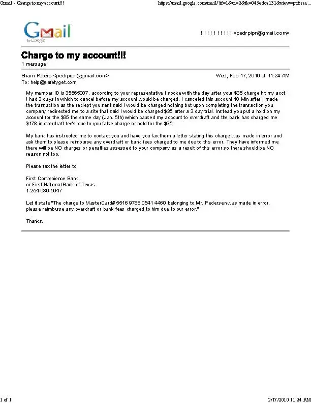 If you've ever had a legitimate billing issue with either of these companies and it hasn't been worked out or you simply gave up due to the excessive hassle. Please contact me at [protected]@gmail.com with a brief explanation of what happened and your contact information and I will provide it to my lawyer who is currently putting together a class action lawsuit against both Safetyget.com andFirst Convenience Bank.