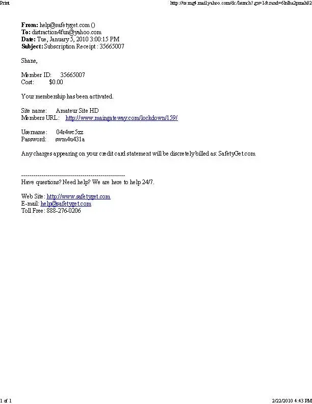 I entered my credit card # in some age verification site that said it would charge nothing ($0.00) to my acct. Then I'm redirected to a page that tells me I've been subscribed to free 3 day membership to some amateur site I didn't even sign up for and I have 3 days to cancel or I'll be charged $34.95. So of course I went and canceled right away, Safetyget.com site shows that it was within 10 min of entering mycredit card at the age verification site. the The next day I go to my bank and they tell me I'm overdrawn because of a hold this company put on my acct. for $35.00 and charge me an overdraft fee due to it. So I file a complaint with the bank (First Convenience Bank), which they did nothing about and told me I would have to get a letter from the company stating the transaction was made in error and asking them to reimburse any charges and fees to my account due to this transaction. So I call safetyget and let them know about it and thatthe bank said there would be no penalty or charges to the company if they sent in the letter. They tell me they don't do that and won't, so I ask for the address of their legal department. The lady tells me they don't have one. I ask where my attorney should send a letter and she tells me goodbye and hung up on me. So much for customer service.