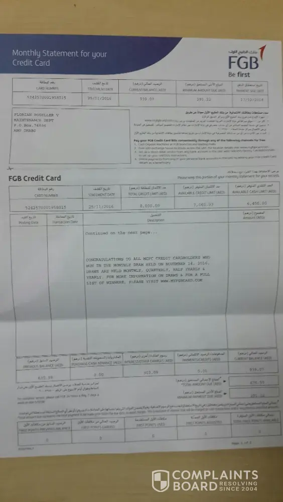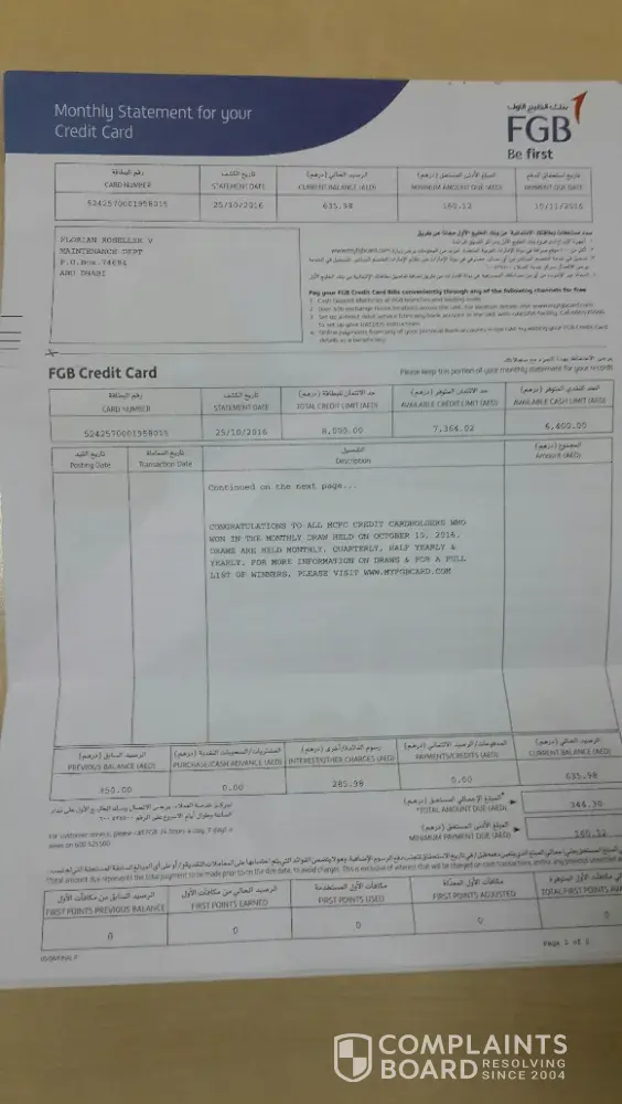 I am a very disappointed customer of fgb bank, after complaining several times regarding irrelevant amount of aed 60 for accidental insurance is charged to me without my authorization, even after my cancellation request and assurance provided by the agent again aed 30 was charged to me for the 2nd time and still the clarity is a question mark?
