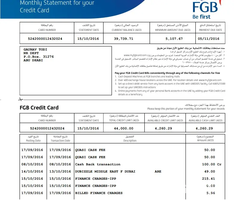 Today i have received my FGB Credit card statement. i don't have any due payment of Statement date of 05/11/2016.