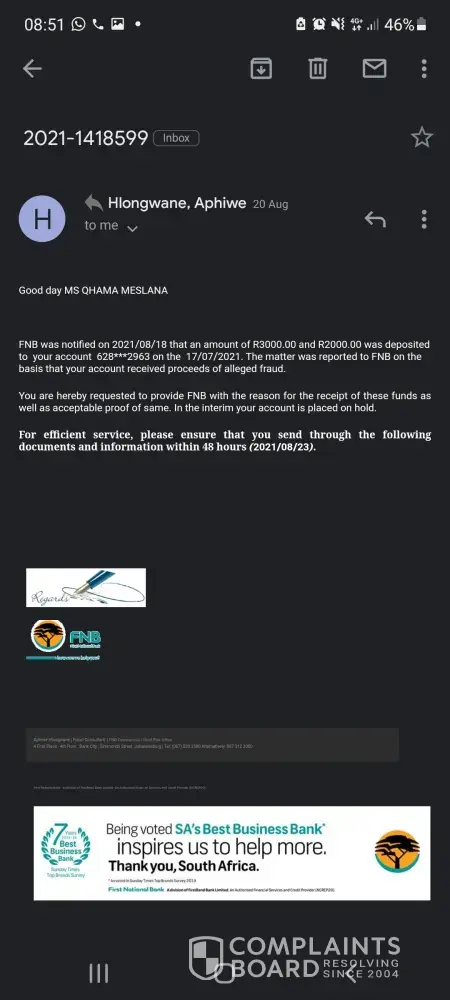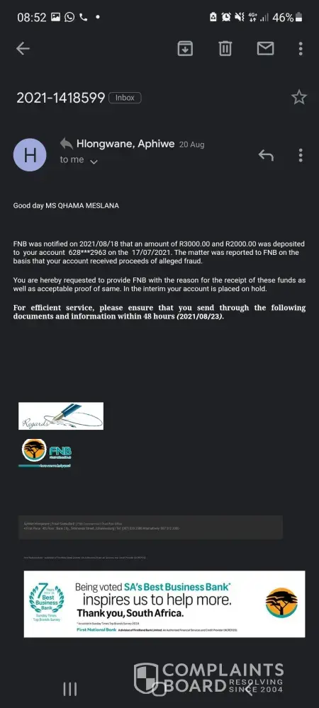 On the 18th August 2021, I received an email from Aphiwe Hlongwana stating I have received proceeds of alleged fraud. I did provide proof and an explanation to what was it about. I have been requesting feedback from him with no reply and what I am not happy about is that my business has been put on hold and I just want the verdict of the case so I close all accounts with FNB and switch banks I am not happy at all