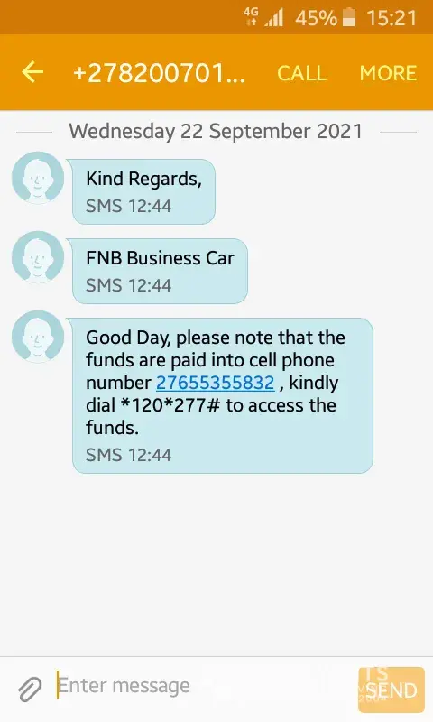 I went home without help on the 15/10/2021. And I had to pay wages that afternoon, but I didn't because Tertius Le Roux is owning FNB according to thr way he acts.
