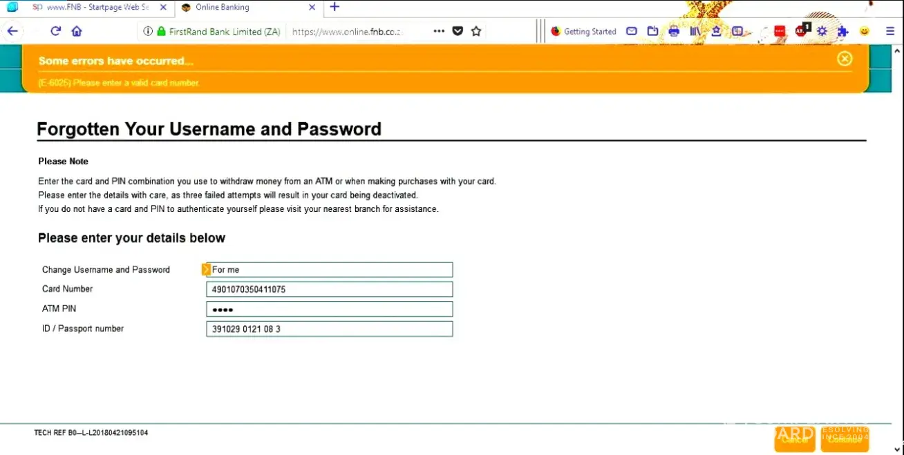 Herewith "Screen prints" referring to my attempts to reset my password on the FNB Home page :- (Please note that the Credit Card number I use is the correct number as on my FNB "Classic" card and the expiry date is - 07/19 issued to Gloria E Fishe.r