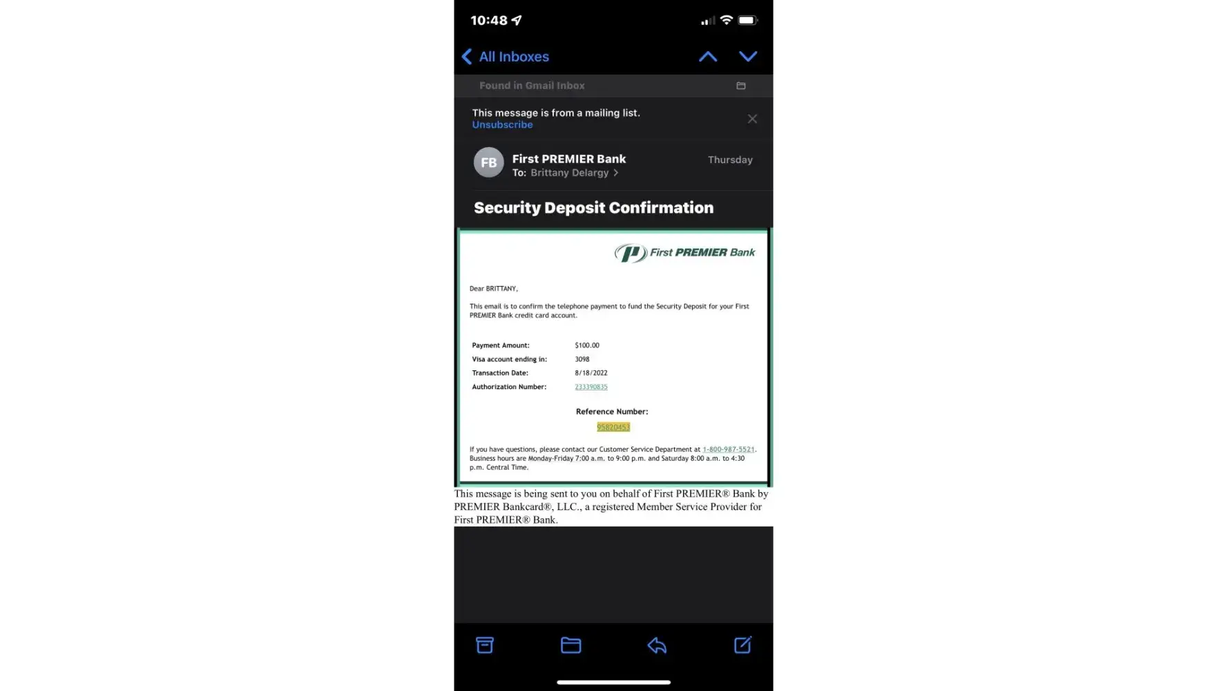 I noticed the receipt. It was by first premier bank.
