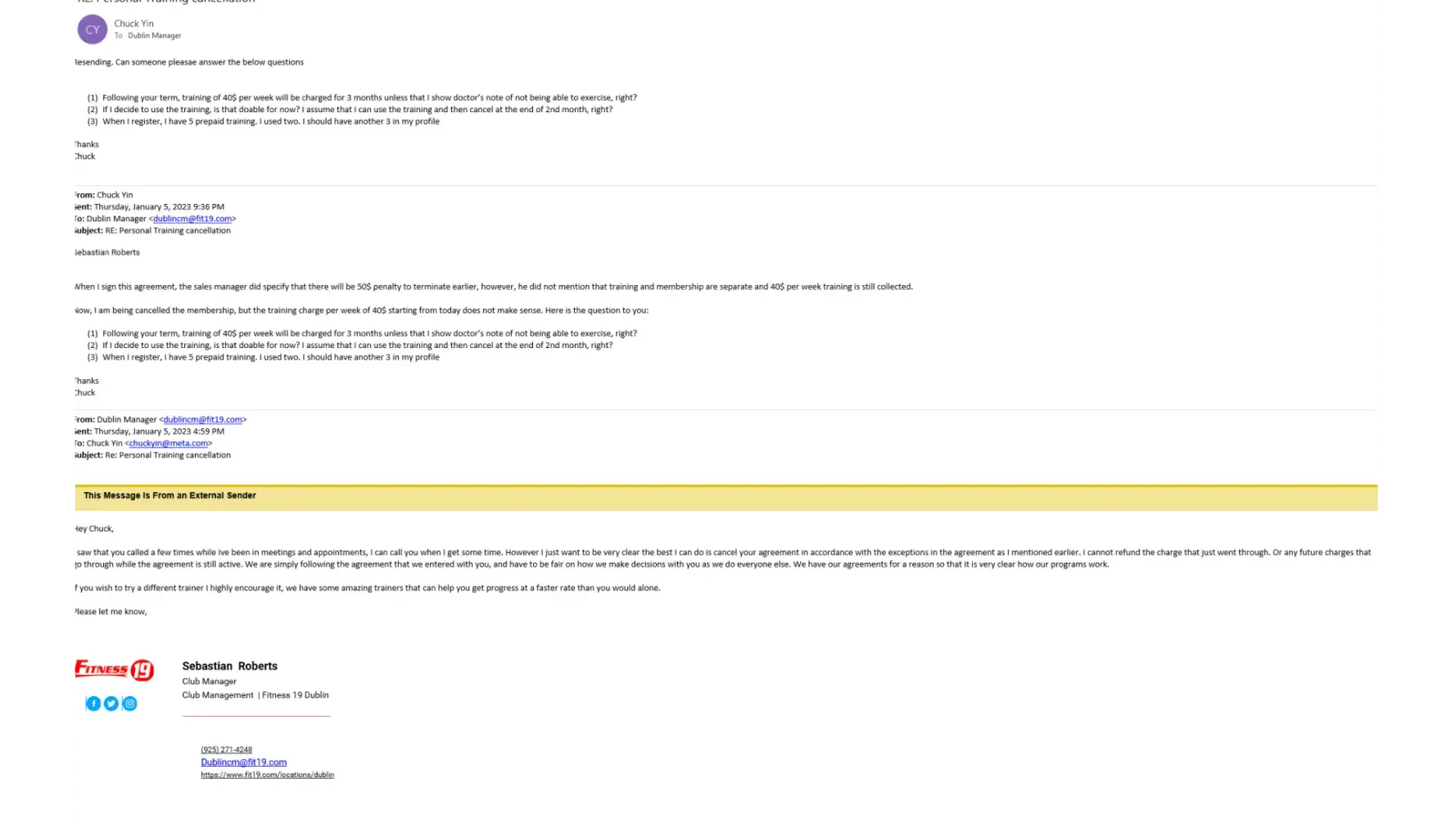 Due to the return-to-office, I am not able to continue commit the training and therefore, cancelled my fitness 19 membership and paid the penalty. However, the store manager Sebastian Roberts keep collecting the training fee. I asked multiple times that I am not able to even get into the gym, how can I get the training? The store manager refused to answer