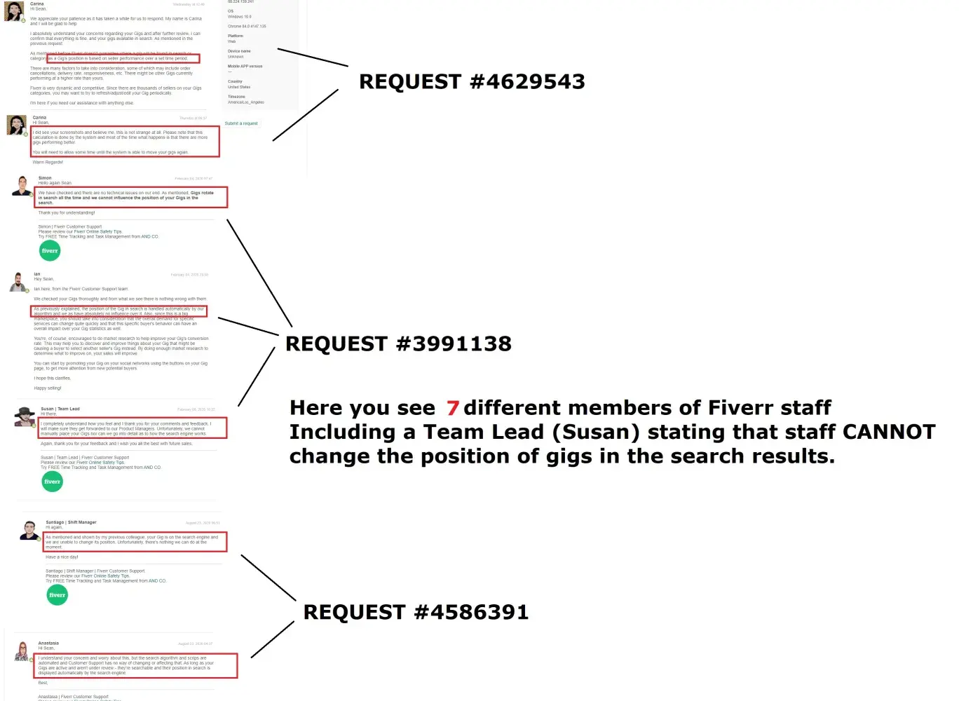 1. Fiverr customer support is lying to it's sellers stating that they cannot influence search presence for gigs. See attachment: "fiverr lying about being able to manually change search presence. Jpg". They closed out my ticket when I had concerns over my search presence making me feel like I was wrong. (see request #4586391). They even threatened me for wasted customer supports time. (see #3991138 where roberto states: "this has been addressed several times now and you are currently spamming customer support, we ask that you refrain from doing so as this will cause your account to be reviewed by our support team.")