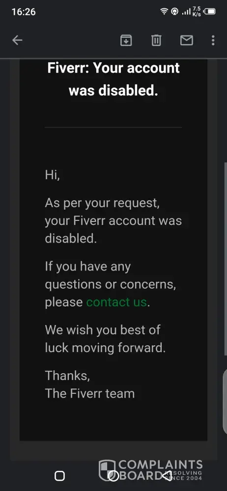 I received the following e mail to [protected]@gmail.com. I strongly object to the contents as I have onlyn ever contacted one person on fiverr and have nmever spoken to anyone else or communicated with anyone else outside of your organisation. Please advise what I did wrong asap