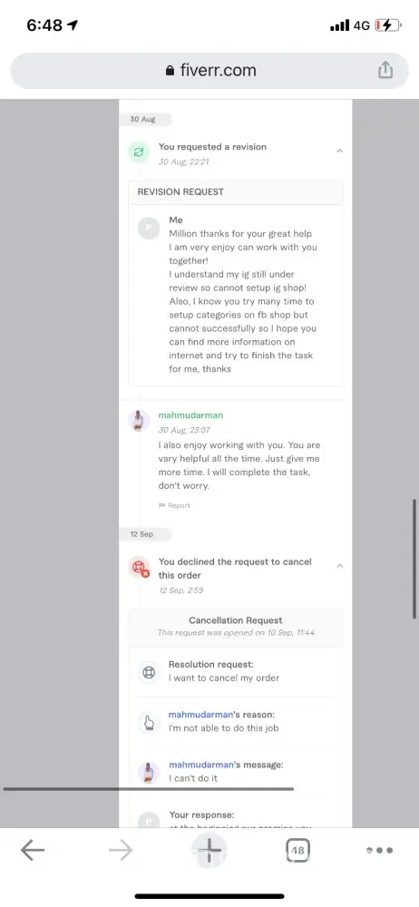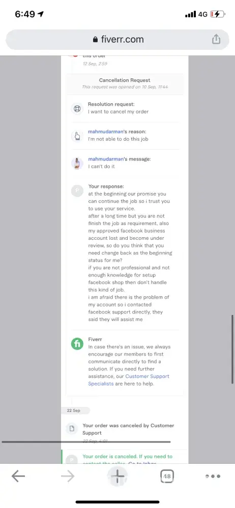 But Fiverr is very clearly I don't want cancel the order because the seller make a mistake cause my Facebook business account lost and o need the seller fix their mistake and finish the order but Fiverr know that still cancel the order!