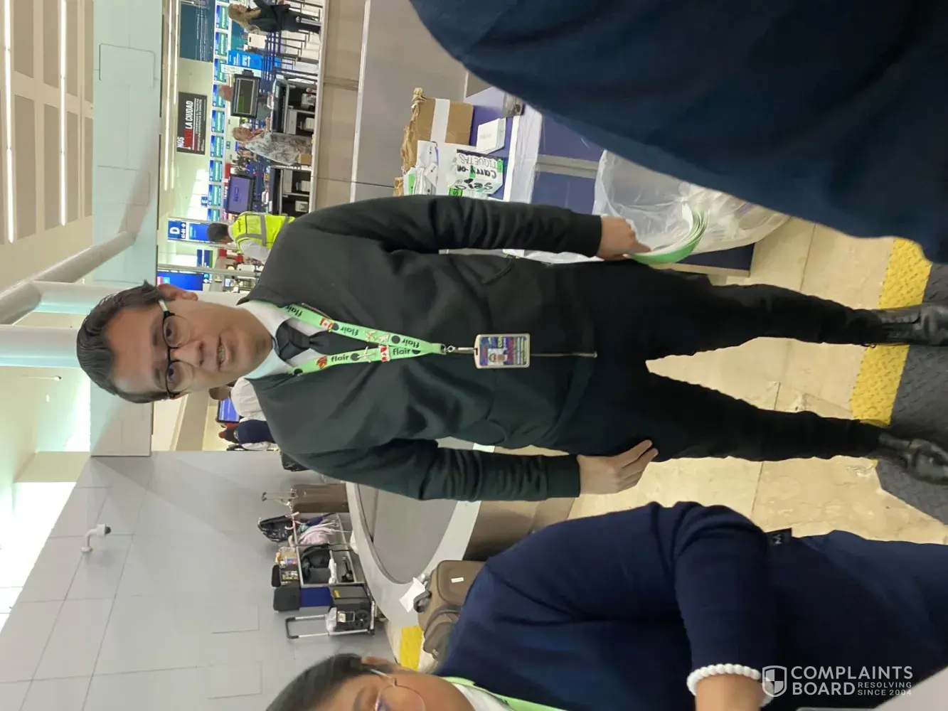 I am DISGUSTED by my experience today with Flair airlines. I was flying home from Cancun airport with 2 kids under 2 and the gate agents told me I have to pay for both their diaper bags for $160.00. I showed the agents, as per their website, that we are permitted to bring a diaper bag, stroller and car seat free of charge. (Keep in mind I paid for checked bags already). They told me if I do not pay for the diaper bags I will be denied boarding. This man pictured here was abusing our family and stating our diaper bag was considered a carry on item and if we don’t pay it they will call security. I will NEVER fly Flair again. Please be aware of this company, they do not honour what their website states and their staff is incompetent