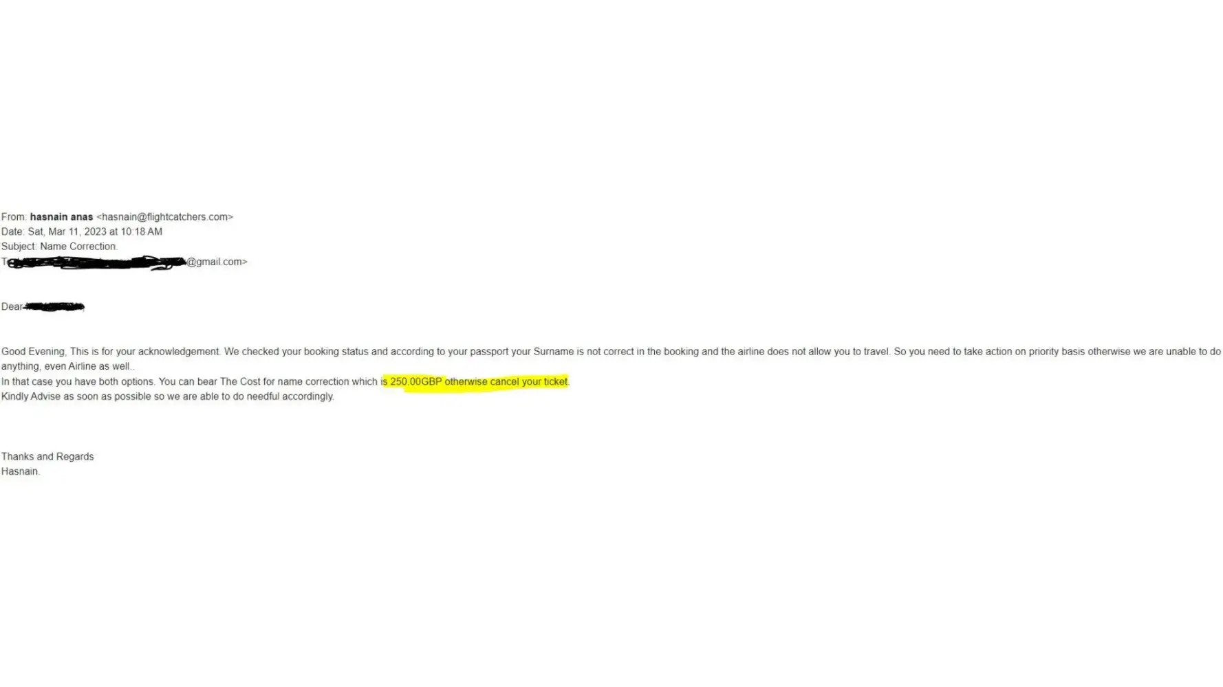 I phoned Flightcatchers on 25/01/2024 and spoke to Faiq and asked him if I could add the letters (Jane) onto my daughters name on her ticket - he said no it can't be done because of the airlines policy - BUT! he can email them and ask - but the reply normally takes about 2 weeks - and I haven't got much time as we fly soon - he was really insistent that I let him know the same day - what I would like to do - he gave me 2 options as per his email below - He this mail was sent 5 minutes after our phone call - in which he says he has spoken to the airline - another lie. As you can see he gives me 2 options - £630 for a name change or request a REFUND. He also told me a new ticket would be £1000 at this stage.(Please ask them for the correspondence they had with the airline - where the airline said it was not possible to change the name - they probably will say they phoned them - so no email - another lie)!