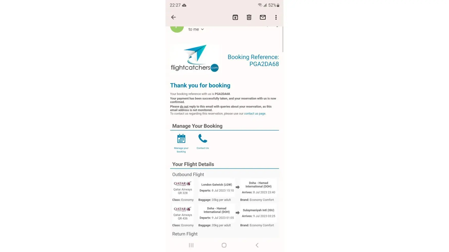 My parent's ticket was booked for 13th February 2023 0925 from Islamabad to Doha - Doha to Manchester. This has caused tremendous stress and anxiety to both my parents. We were NOT informed of the delayed flight. We have spoken to the British Airline and they have said, they contacted [protected]@flightcatcher to inform of the delayed flight. We have heard absolutely nothing. My parents are both elderly and my father who is wheelchair bound and disabled really struggle to get to the airport in the first place, only to be told his flight had been delayed. I am sorry to say I and very disappointed with flightcatcher, and will be taking further action.