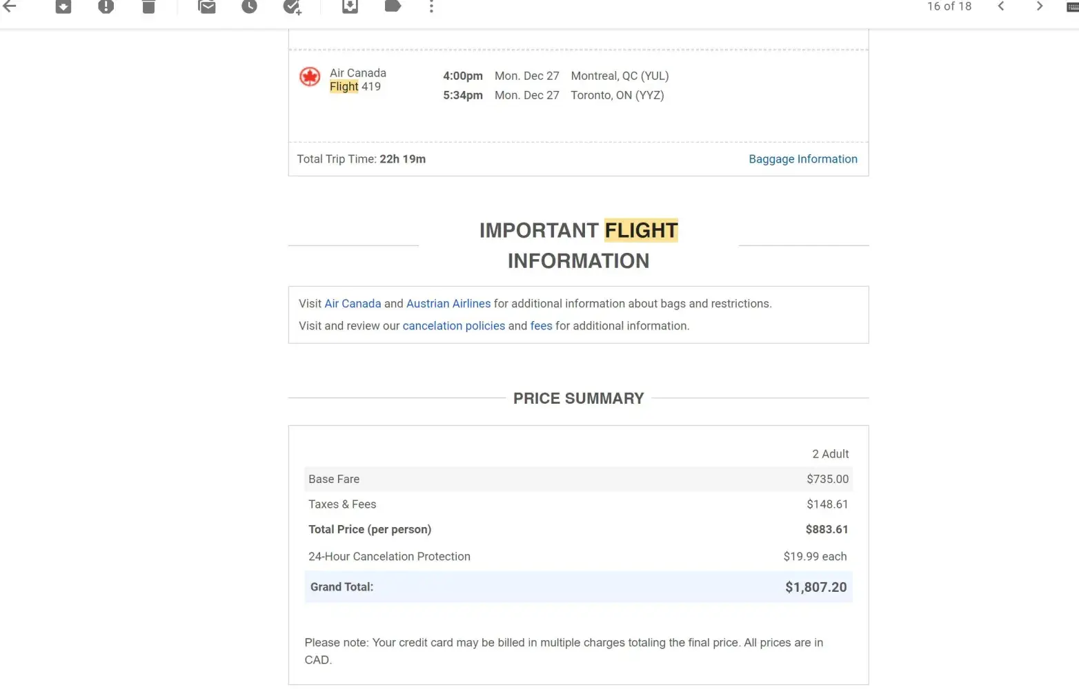 ** September 27th, 2021: Reserved flight for two departing on November 27th, 2021 arriving to destination on November 28th, 2021. (FlightHub Booking Number: 199-299-542) (Air Canada Confirmation Number: 3S9Z92) ** October 30th, 2021: Received email from FlightHub subjected "Itinerary Update" that contained the following message "Important - Your Itinerary...
