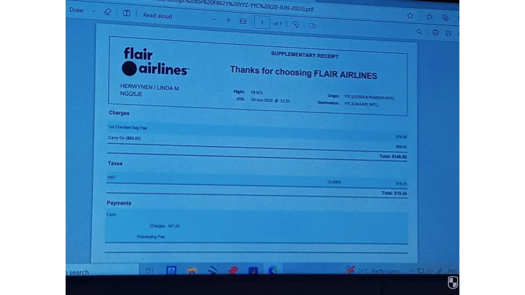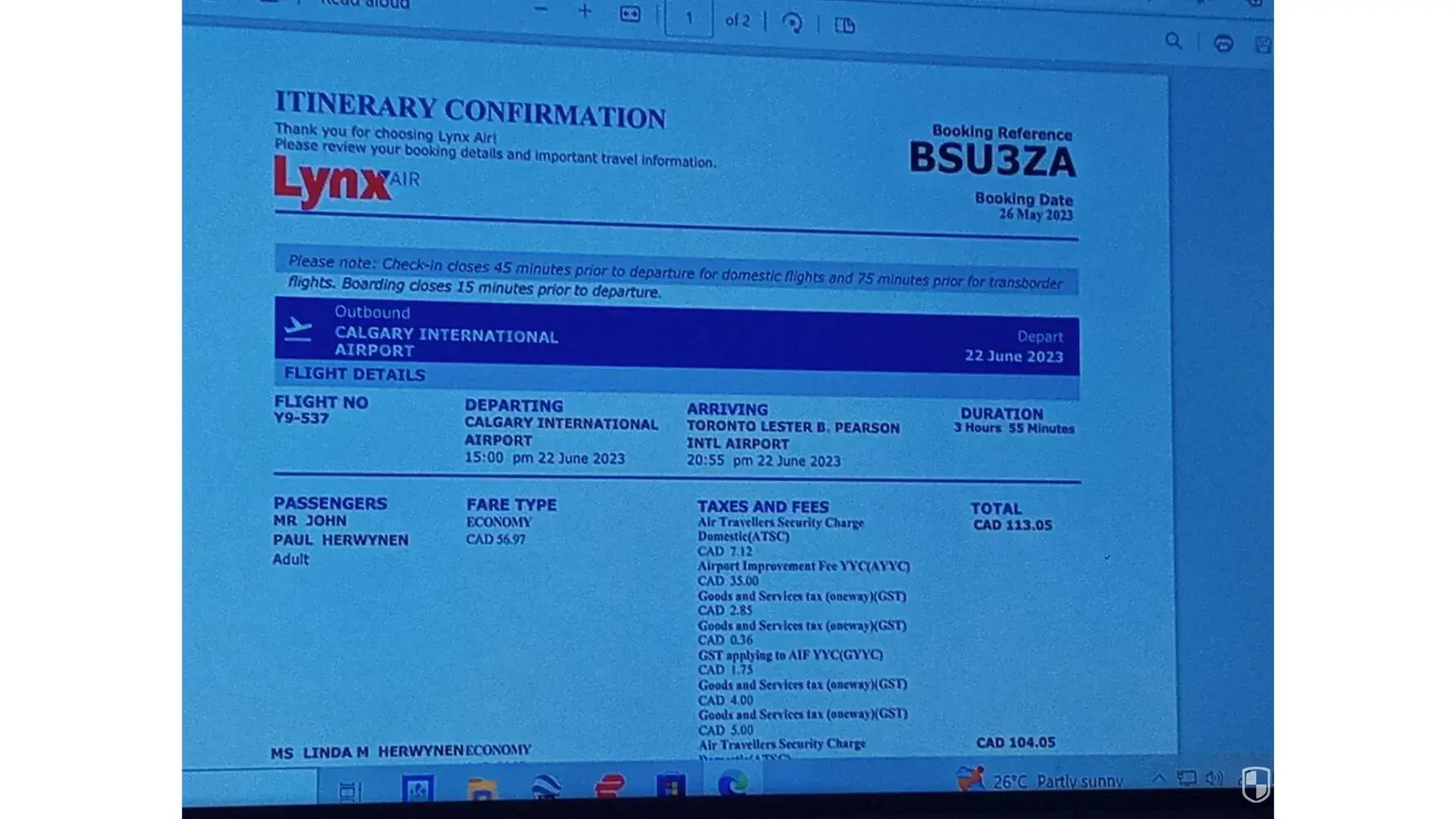 We traveled to Calgary from Toronto on Flair Airlines flight 621 at 12:35 PM on Tue. June 20 and returned on Lynx flight 537 at 3:00 PM. Thu. June 22.